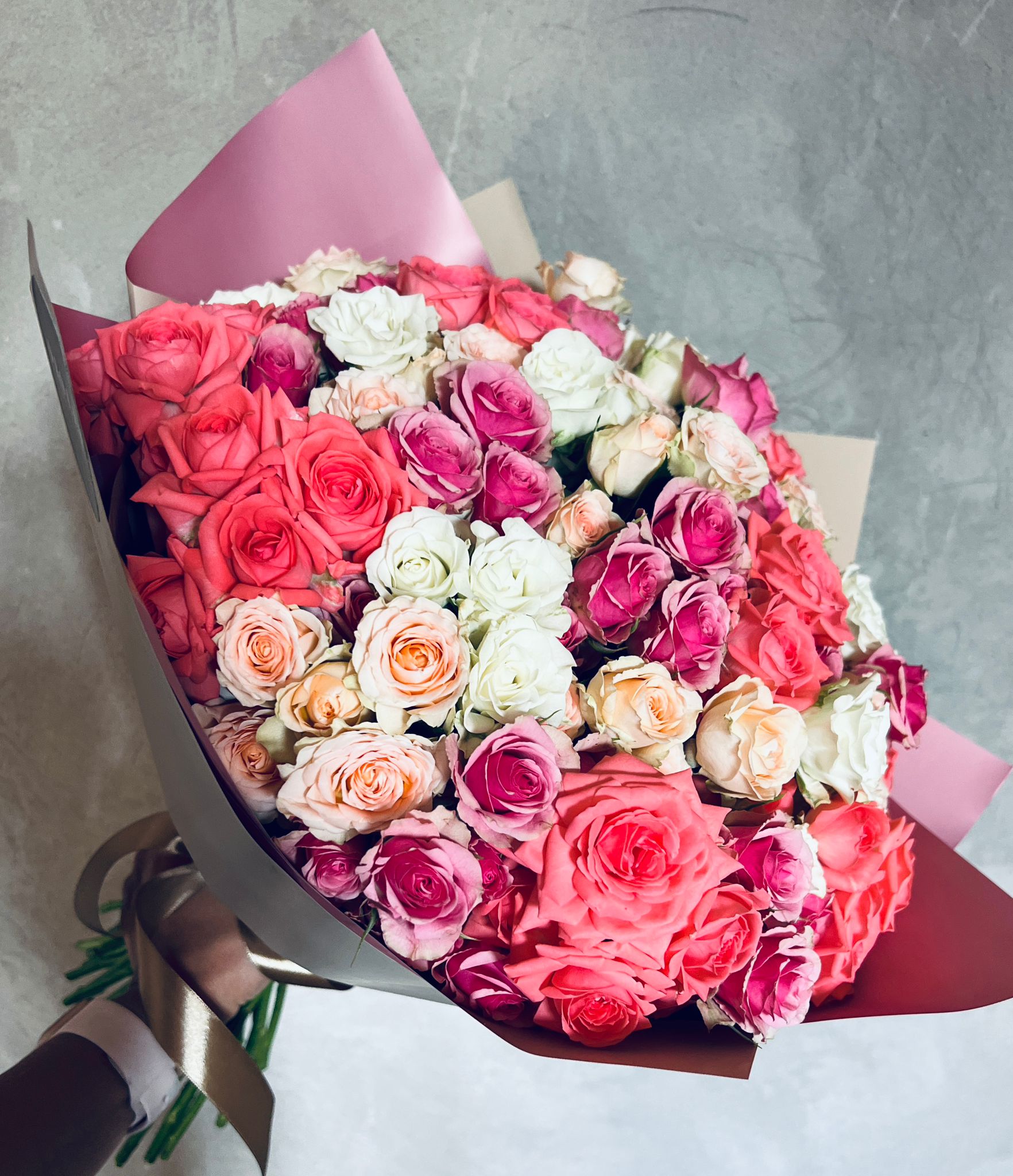 Букет состоит из свежих кремово-розовых кустовых роз длиной 50 см. Такая длина придаёт букету элегантную форму — он изысканно смотрится в руках и красиво раскрывается в вазе. Упаковочная бумага дополняет композицию, позволяя цветам оставаться в главной роли.