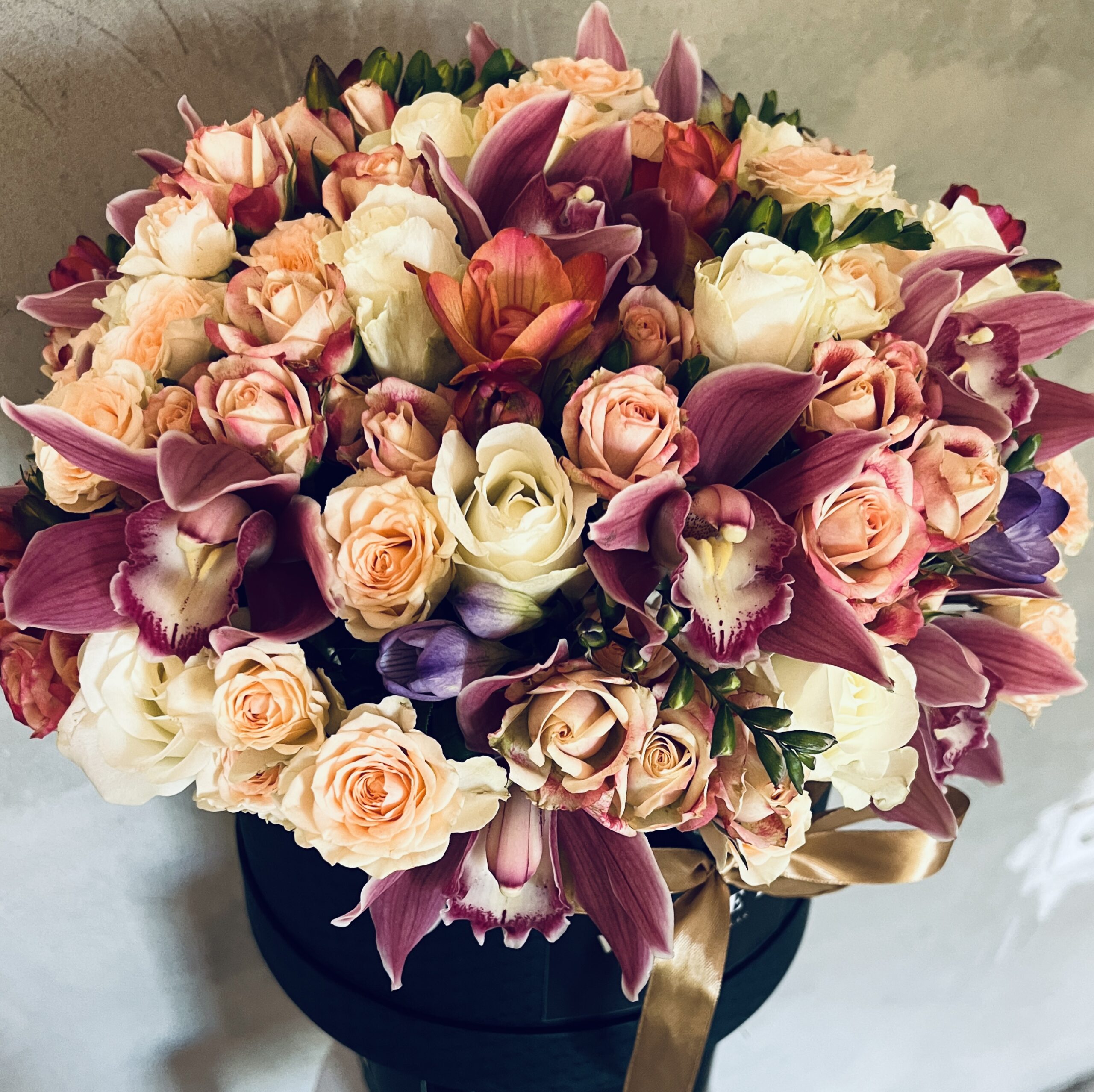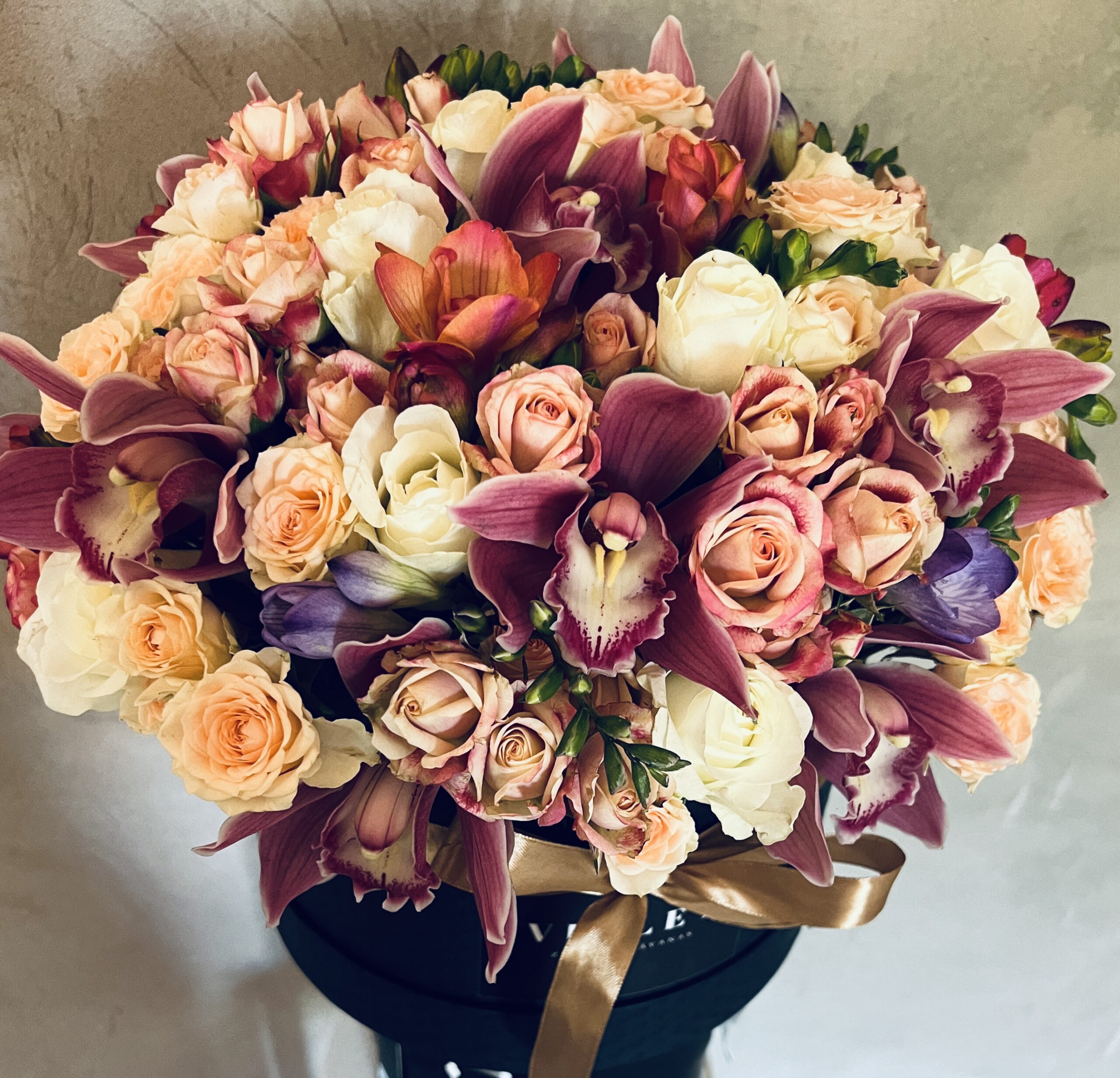 Количество цветов может незначительно отличаться в зависимости от размера головки цветка. Композиция на изображении носит иллюстративный характер. Возможны небольшие изменения в цветочных композициях и цветочных коробках. Цвет цветов или состав цветов могут незначительно отличаться в зависимости от сезонности. Наши флористы создадут самую красивую цветочную композицию, которая сохранит суть цветочной коробки, изображенной на картинке. VIOLET.LV свяжется с вами лично для изменений в цветочных композициях или цветочных коробках.